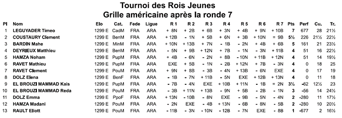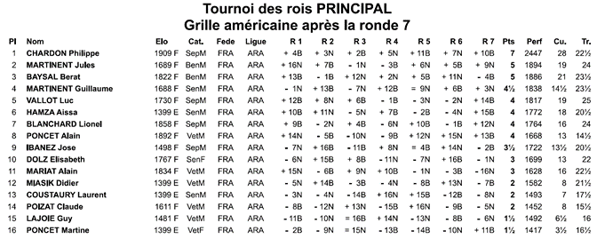 Le tournoi jeunes a vu la victoire de Timéo (7 points), devant Clément (5.5 points, meilleur 1ère année du tournoi jeunes) et Mahé (5 points) (voir le classement final détaillé en dessous). Le tournoi principale a vu la victoire de Philippe (7 points) devant Jules (5 points, meilleur jeune du tournoi principal) et Berat (5 points). Ces deux derniers, encore tous les 2 benjamins, ont réalisé un très beau parcours en donnant du fil à retordre aux plus anciens (voir le classement final détaillé en dessous).