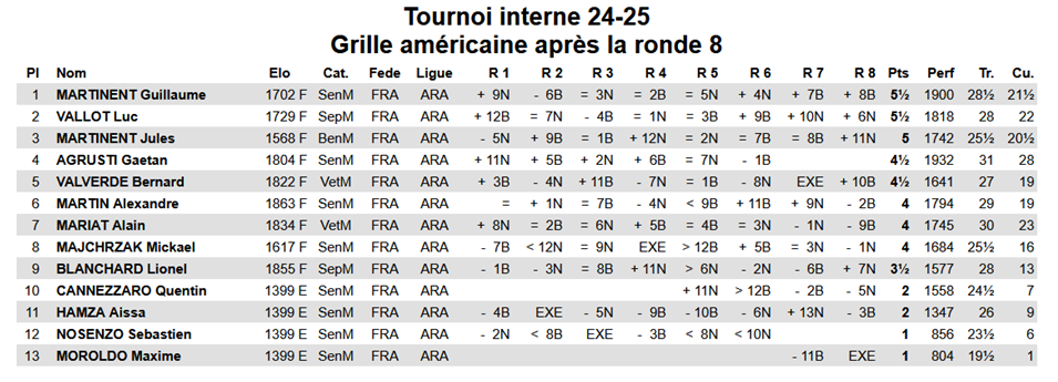 Et c’est Guillaume Martinent qui termine premier avec 5.5 sur 8 points possibles et remporte la coupe. Luc Vallot termine 2ème avec 5.5 points et Jules Martinent termine 3ème avec 5 points.