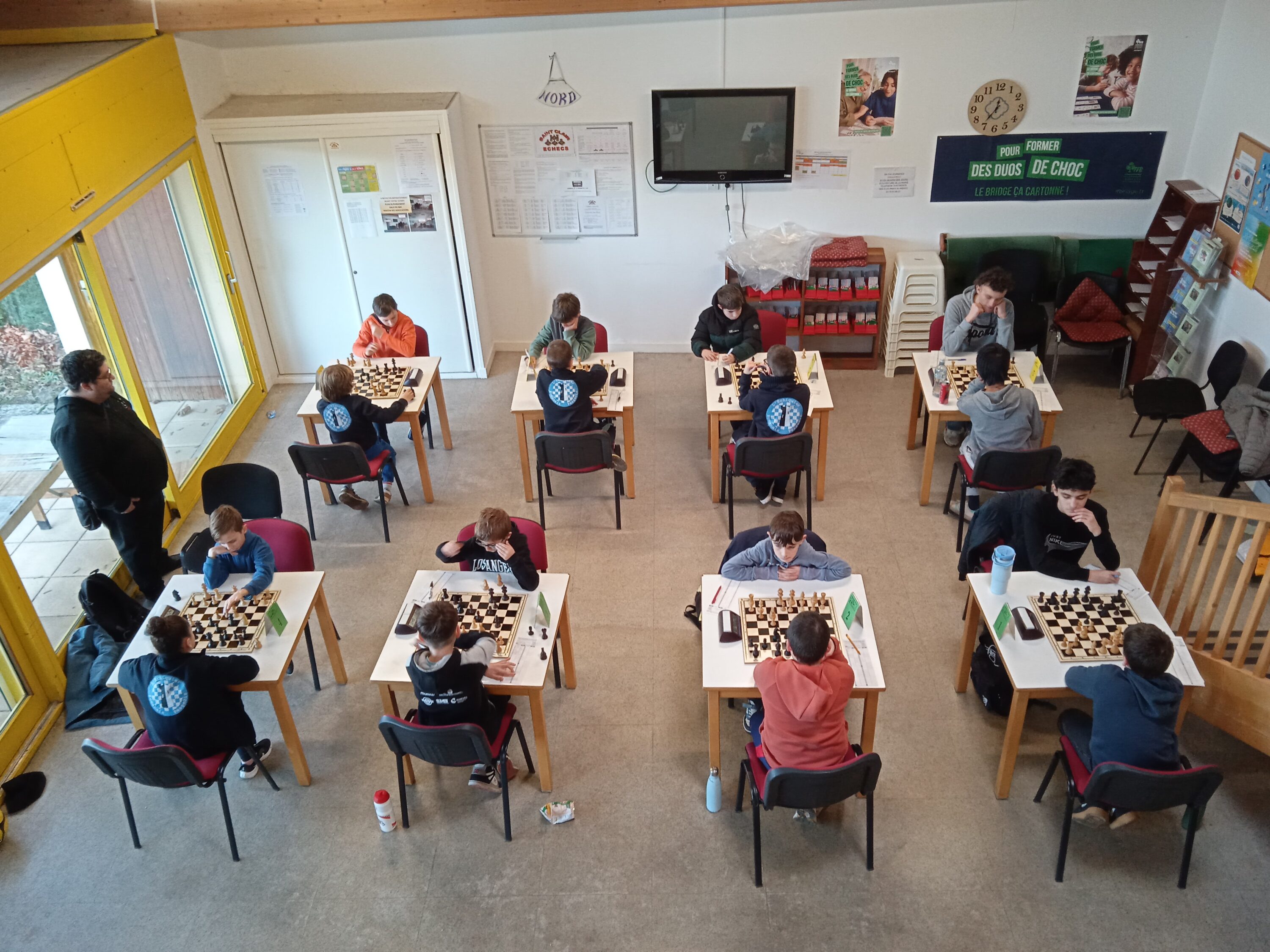 Les joueurs sont concentrés pour la ronde 5. Berat, Jules, Mathieu et Clément sont à l’oeuvre (respectivement de la table 1 à la table 4 en vert, nos joueurs sont de face)