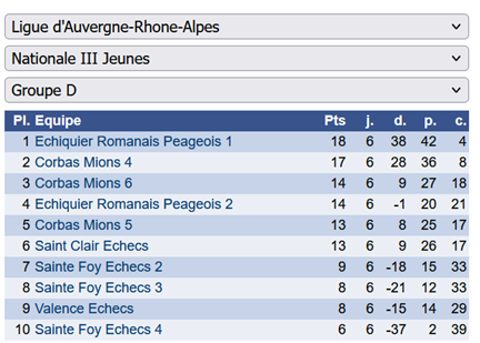 Classement de la poule D de Nationale 3 jeunes après 6 rondes